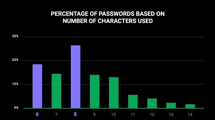 อันดับ 1 คือ 8 ตัวอักษรมีอยู่ 26 % ซึ่งก็ไม่แปลกใจเท่าไหร่เพราะจำนวน 8 ตัวอักษรเป็นมาตรฐานและนโยบายทั่วไปที่แพลตฟอร์มต่าง ๆ กำหนดไว้ให้ผู้ใช้ที่สมัครสมาชิกว่าต้องไม่ต่ำกว่านี้ เพื่อป้องกันความเสี่ยงจากการถูกแฮ็ก ส่วนอันดับ 2 คือ 6 ตัวอักษร ส่วนหนึ่งน่าจะเพราะคนชอบตั้งเลข '123456' นั่นแหล่ะ