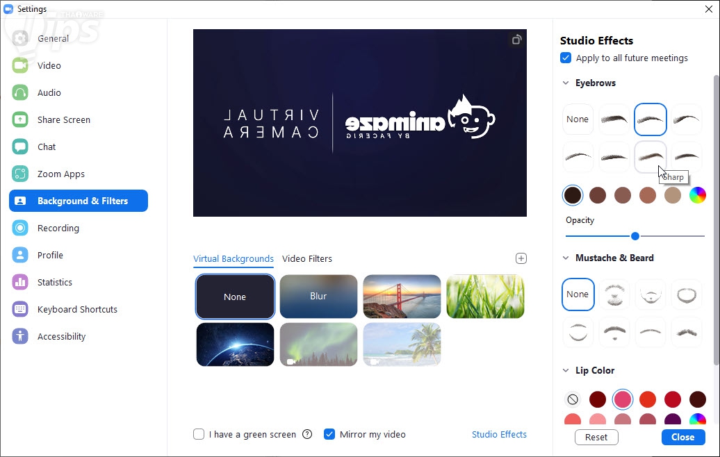 อันที่จริง การเปิดใช้งาน Studio Effects ของ โปรแกรม Zoom Meeting ไม่ได้ทำให้คุณภาพของวิดีโอดีขึ้นเสียทีเดียว แต่ก็พอช่วยให้ตัวคุณที่ปรากฎในหน้าจอนั้นดีขึ้นได้ เพราะว่ามันมีออปชันที่เกี่ยวกับการปรับแต่งหน้าตาของเรา เช่น เปลี่ยนสีริมฝีปาก, รูปคิ้ว, หนวด เป็นต้น