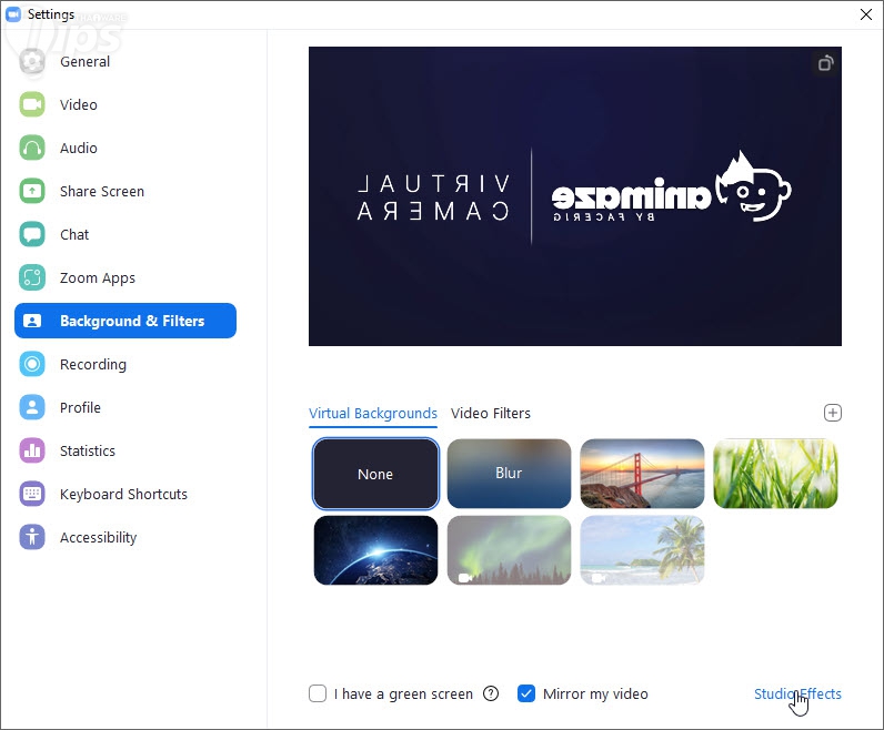 2. คลิกเลือก "เมนู Background & Filters" ทางด้านซ้าย เลือก "เมนู Studio Effects" ที่มุมขวาล่างของหน้าต่าง จะมีกล่องข้อความขึ้นมาให้เรากดดาวน์โหลดเอฟเฟคมาไว้ในเครื่องให้เรียบร้อย