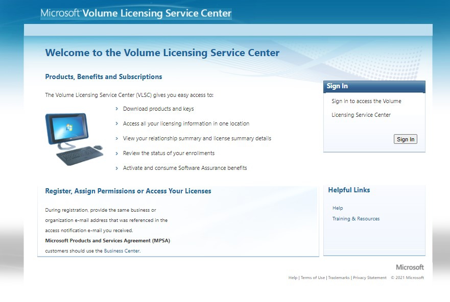 ภาพตัวอย่างโปรแกรม Microsoft Volume Licensing Service Center