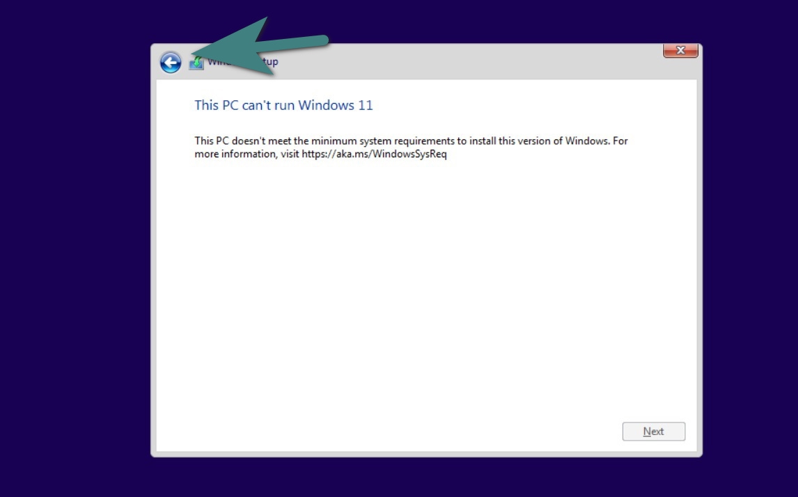 หลังที่เราทำ USB เป็น Installation Media แล้วบูตคอมพิวเตอร์ใหม่ผ่านไดร์ฟ USB เพื่อเริ่มติดตั้งระบบปฏิบัติการ Windows 11 ไปตามปกติ แน่นอนว่าเมื่อฮาร์ดแวร์เราไม่รองรับ เราก็จะพบกับหน้าต่างแจ้งเตือนว่า "This PC can’t Run Windows 11" ก็กด "ปุ่ม Back" เพื่อย้อนกลับไปที่หน้า Installer ภาพจาก : https://min.news/en/tech/5ac6205ed0071f883a9e0c4fa99d4bd1.html