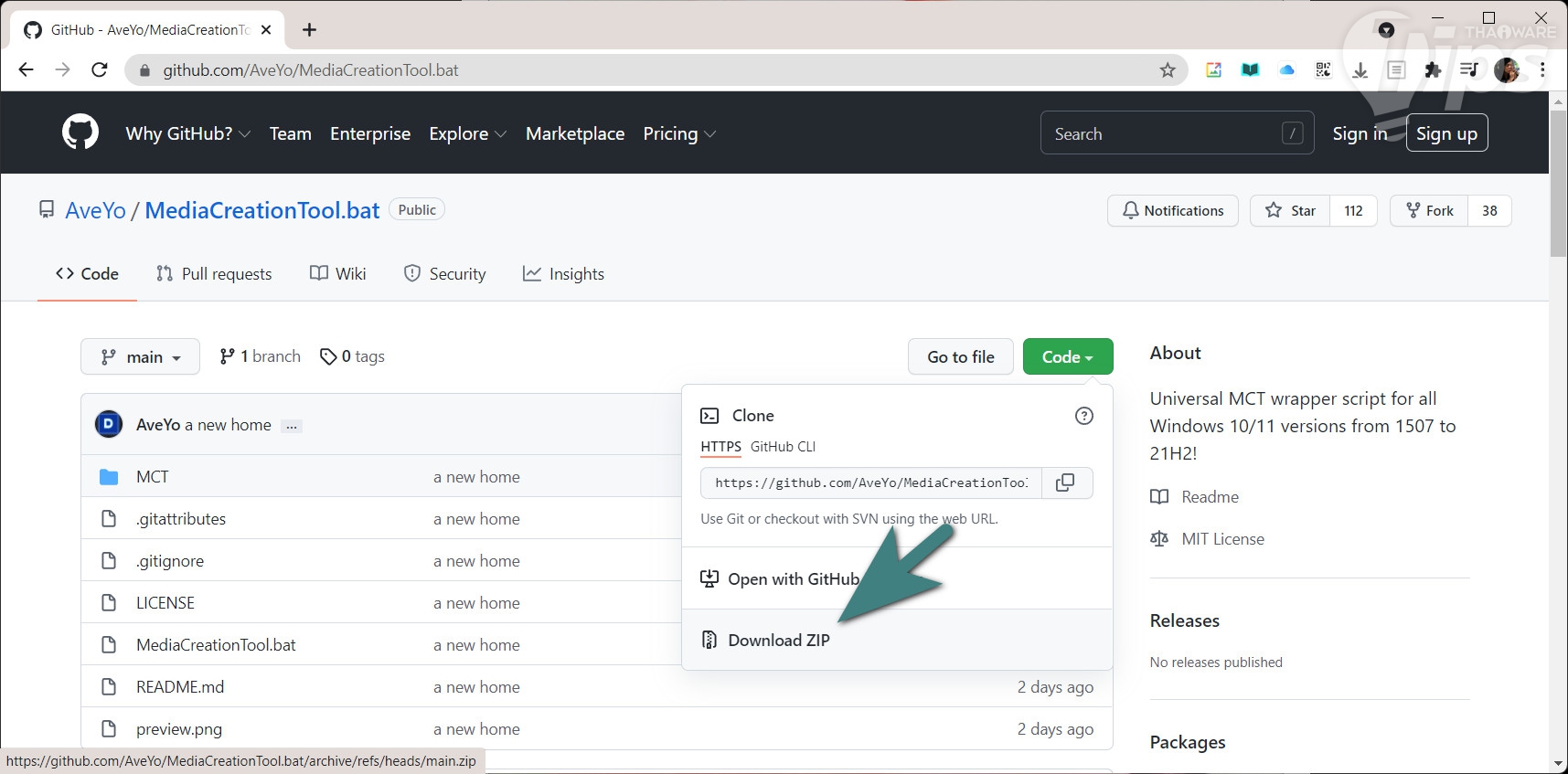 ไปที่เว็บไซต์ https://github.com/AveYo/MediaCreationTool.bat คลิกที่ "ปุ่ม Code" แล้วเลือก "เมนู Download ZIP"