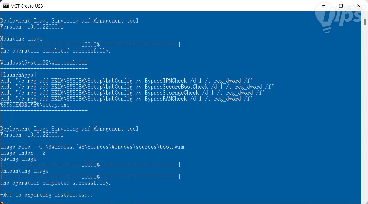 หากสังเกตที่หน้าต่าง MCT Create USB ก็จะพบว่ามันได้เพิ่ม Registry ลงไปในไฟล์ติดตั้งให้เราแล้ว รอจนเสร็จ แล้วคลิก "ปุ่ม Finish" ในหน้าต่าง Windows 11 Setup แล้วสามารถนำ USB ไดร์ฟไปใช้ติดตั้งระบบปฏิบัติการ Windows 11 ได้ทันที เท่านี้ ก็หวังว่าเพื่อน ๆ จะสามารถติดตั้ง ระบบปฏิบัติการ Windows 11 ได้แล้วนะ แม้จะไม่มีฮาร์ดแวร์ที่ถูกต้องตรงกับความต้องการของตัวระบบก็ตาม