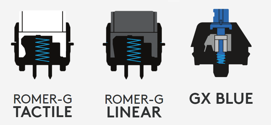 สวิตช์ จากค่าย Logitech ผู้ผลิตอุปกรณ์คอมพิวเตอร์ชื่อดัง Stem เป็นรูปสี่เหลี่ยม ทำให้ไม่สามารถใช้งานกับ Keycap ที่เป็นมาตรฐาน Cherry ได้ กลไกการทำงานก็แตกต่างกัน โดยจะมีระยะ Actuation ที่สั้นกว่า Cherry จึงทำให้ตอบสนองได้ไวกว่า แต่ก็ทำให้ผู้ใช้บางคนอาจจะรู้สึกว่ามัน "ตื้น" เกินไป