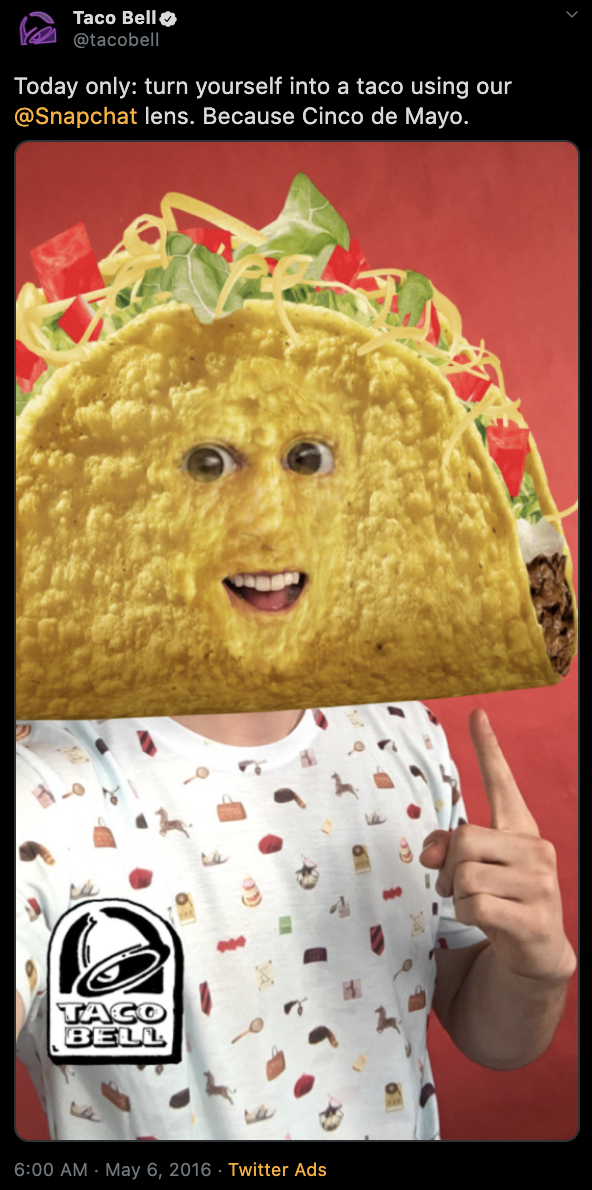 ตัวอย่างเช่น ทางบริษัท Snapchat ได้รับการสปอนเซอร์จากบริษัท Taco Bell ให้เพิ่มฟิลเตอร์ “ทาโก้” ขึ้นมาบนแอปพลิเคชัน ซึ่งเมื่อโฆษณานี้ปล่อยออกไปก็ทำให้ผู้ที่สนใจใช้งานฟิลเตอร์นี้ทำการ “ดาวน์โหลด Snapchat” มาเล่น และทาง Taco Bell เองก็น่าจะได้ลูกค้าเพิ่มจากการซื้อสปอนเซอร์ในครั้งนี้ด้วยเช่นกัน