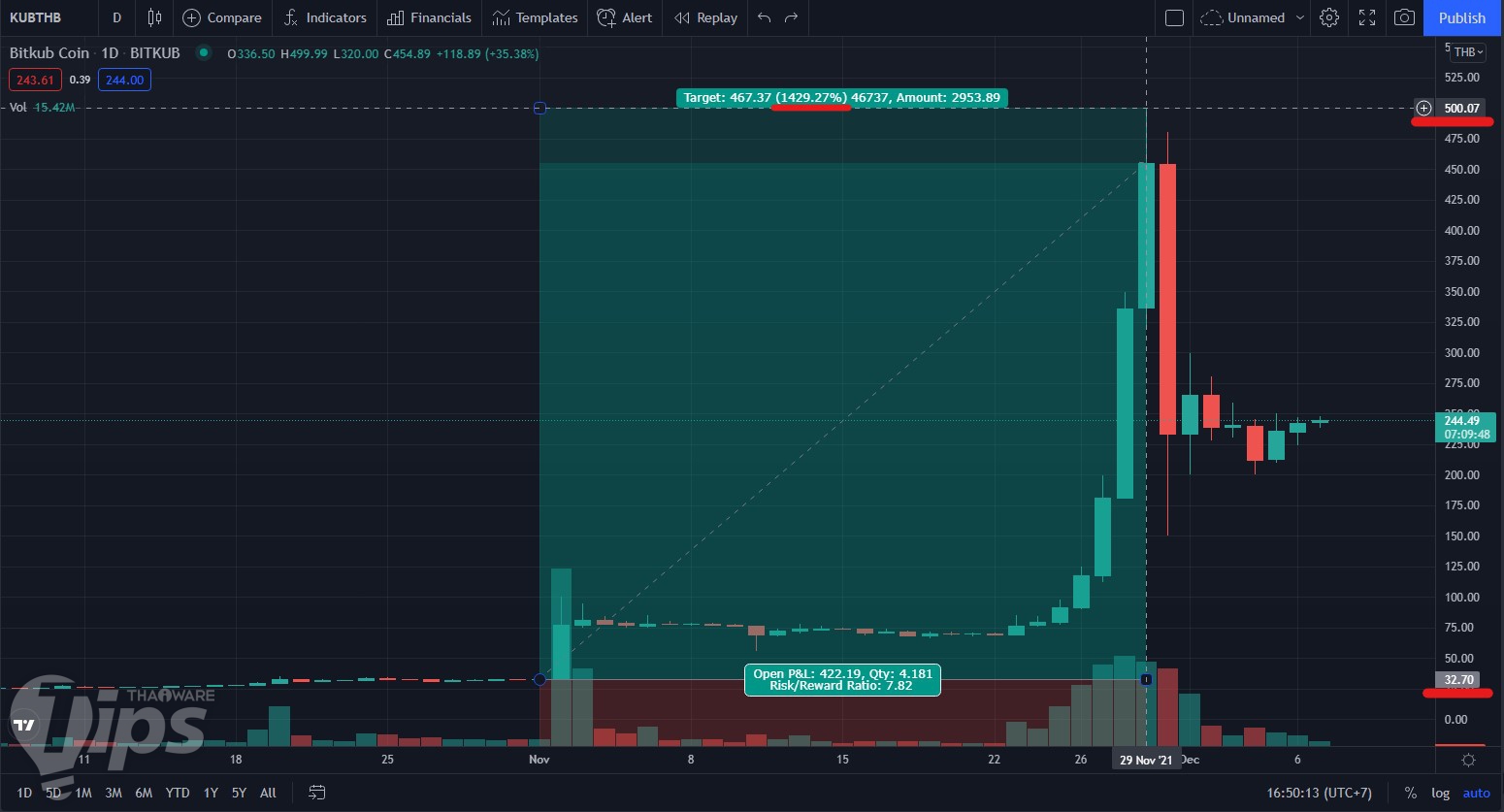 ตัวอย่างการมูนที่เห็นได้ชัดจากเหรียญ KUB ของ Bitkub ขึ้นไปถึง 1428% สำหรับคนที่เข้าซื้อตอนราคาหน่วยละ 32.70 บาท เมื่อราคาพุ่งขึ้นไปถึงหน่วยละ 500 บาท