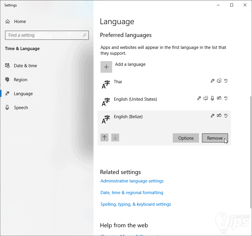 วิธีนี้เป็นพื้นฐานแบบกำปั้นทุบดินหน่อย ๆ ก็คือถ้าไม่ได้มีกรณีพิเศษอะไร เราอาจจะเผลอเพิ่มภาษาเข้าไปจากการตั้งค่าโดยไม่รู้ตัว ก็เข้าไป ลบภาษา (Language) ของคีย์บอร์ด ที่ไม่ใช้ออกไปได้เลย ส่วนวิธีการทำได้ดังนี้