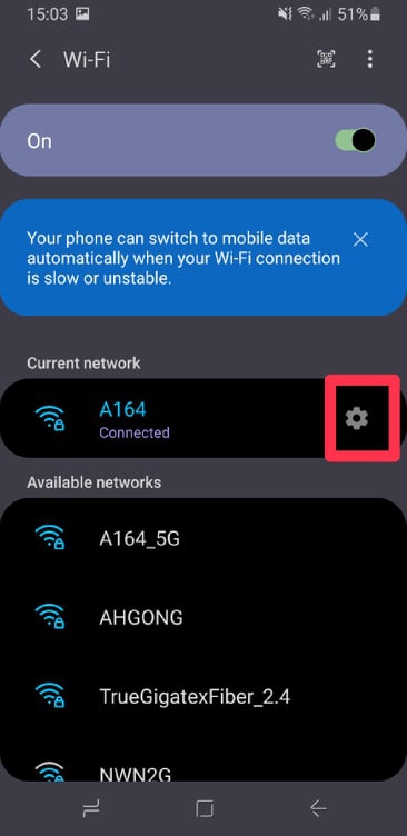 3. จากนั้นเปิดเมนูการตั้งค่าการใช้งาน Wi-Fi (ไอคอนรูปเกียร์ด้านข้าง Wi-Fi ที่เชื่อมต่ออยู่ในตอนนี้)
