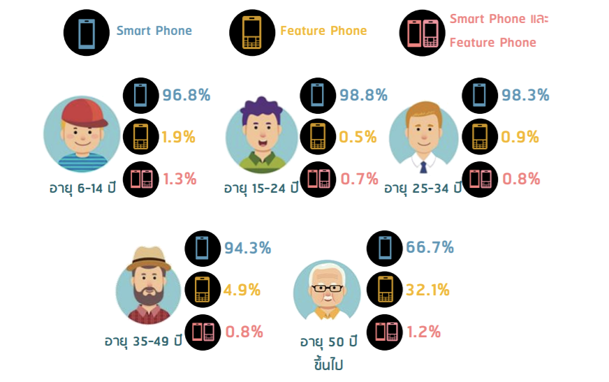 จะเห็นว่า อัตราการใช้งานสมาร์ทโฟนสูงกว่าการใช้งานแบบอื่น ๆ ในทุกช่วงอายุ ยิ่งในกลุ่มอายุ 6-14 ขวบ มีผู้ใช้สมาร์ทโฟนมากถึง 96.8% เลยทีเดียว เรียกได้ว่าเด็กและเยาวชนไทยเข้าถึงมือถือและอินเทอร์เน็ตเป็นส่วนมาก เมื่อเทียบกับจำนวนผู้ถูกสำรวจในกลุ่มอายุ 6-14 ขวบ