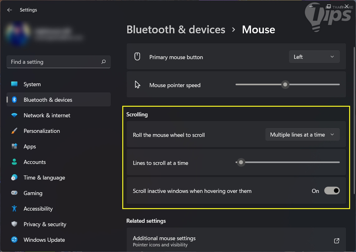 กด "ปุ่ม Windows + i" เพื่อเปิด "หน้าต่าง Settings" ขึ้นมา ในพาเนลด้านซ้าย คลิกที่ "เมนู Accessibility" ในพาเนลด้านขวา คลิกที่ "เมนู Mouse" ตามด้วย "เมนู Mouse" ใต้ "หัวข้อ Scolling" จะมี ตัวเลือกให้เราปรับแต่ง ดังนี้ Roll the mouse wheel to scroll (หมุน Mouse wheel เพื่อเลื่อน) : จะมีการทำงานให้เลือก 2 รูปแบบ คือ Multiple lines at a time (ครั้งละหลายบรรทัด) และ One screen at a time (ครั้งละหน้าจอ) Lines to scroll at a time (จำนวนบรรทัดที่จะเลื่อนในแต่ละครั้ง) : หากเราเลือกใช้งานแบบ Multiple lines at a time เราจะสามารถปรับแต่งจำนวนบรรทัดได้ที่เมนูนี้ Scroll inactive windows when hovering over them : เลื่อนหน้าต่างที่ไม่ได้ใช้งาน เมื่อวางเมาส์ Pointer เหนือหน้าต่างเหล่านั้น