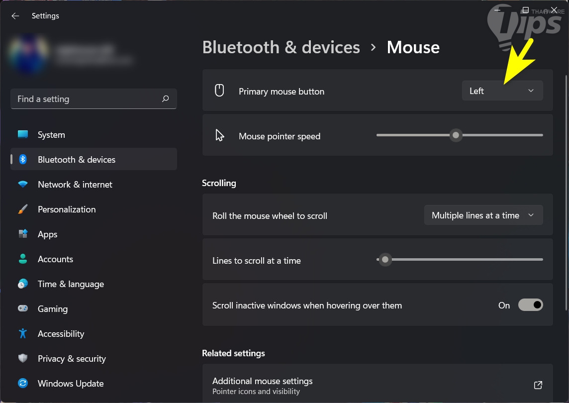 กด "ปุ่ม Windows + i" เพื่อเปิด "หน้าต่าง Settings" ขึ้นมา ในพาเนลด้านซ้าย คลิกที่ "เมนู Accessibility" ในพาเนลด้านขวา คลิกที่ "เมนู Mouse" ตามด้วย "เมนู Mouse" ตรง "หัวข้อ Primary Mouse Button" เปลี่ยนจาก "Left (ซ้าย)" เป็น "Right (ขวา)"