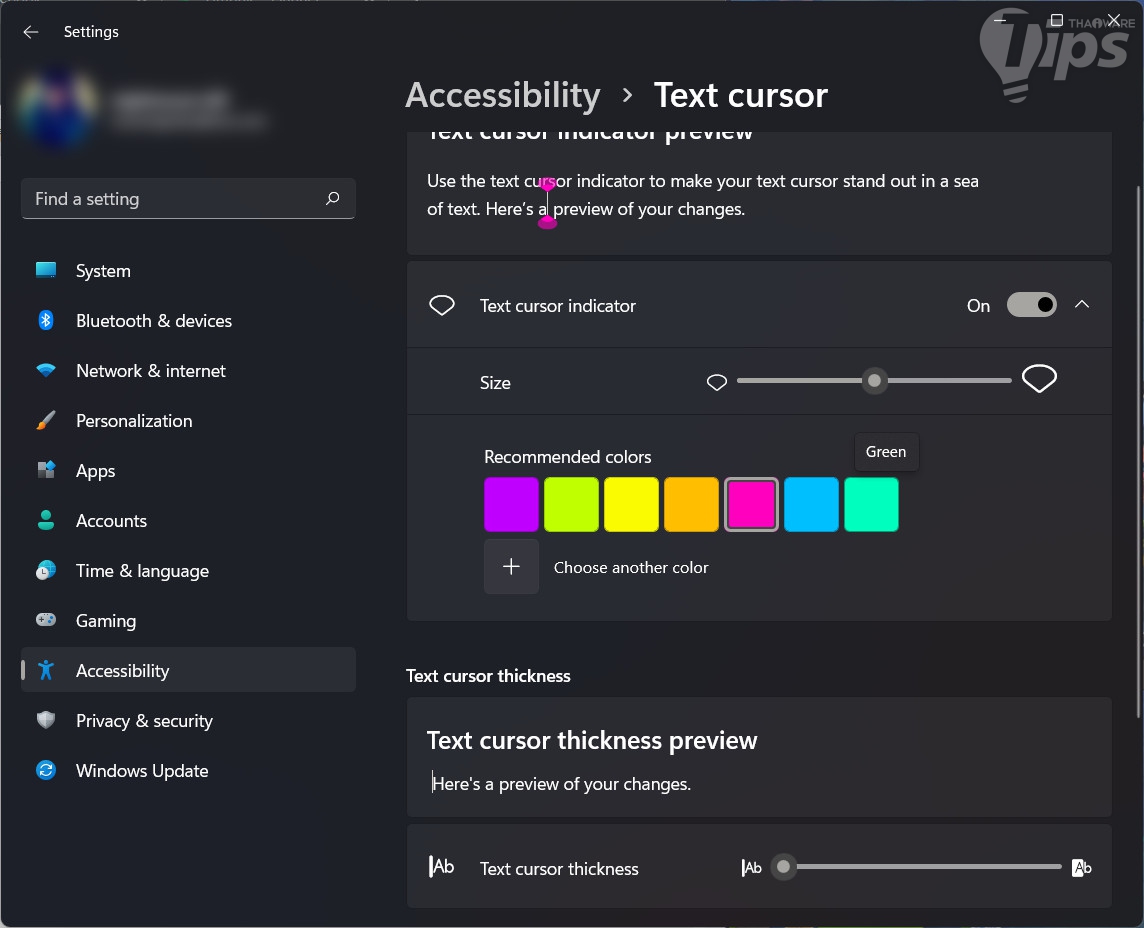 กด "ปุ่ม Windows + i" เพื่อเปิด "หน้าต่าง Settings" ขึ้นมา ในพาเนลด้านซ้าย คลิกที่ "เมนู Accessibility" ในพาเนลด้านขวา คลิกที่ "เมนู Mouse" ตามด้วย "เมนู Mouse" แล้วตามด้วย "เมนู Mouse Pointer" คลิกที่ "เมนู Text Cursor" ปรับขนาดที่ "เมนู Size", เลือกสีได้ที่ "เมนู Recommended Colors" หากอยากได้สีอื่น ให้คลิกที่ "เครื่องหมาย +", ปรับความหนาของตัว Cursor ได้ที่เมนู "Text Cursor Thickness"