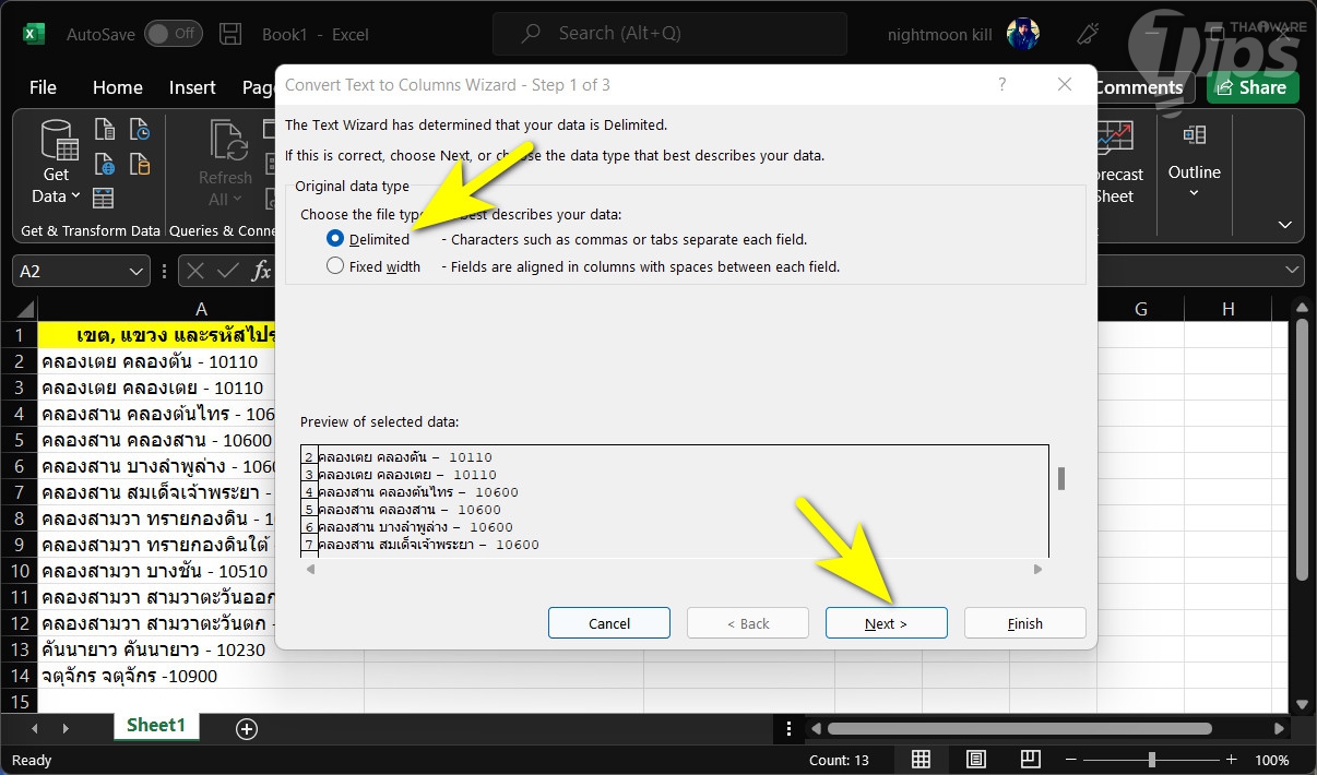 สำหรับวิธีการแรก เราจะใช้ "คุณสมบัติ Text to Columns" คล้ายกับการ แยกชื่อ-นามสกุล ที่อยู่ใน Cell เดียวกัน ออกเป็น 2 Cells ที่เราเคยนำเสนอไปแล้ว แต่จะเปลี่ยนรูปแบบการตั้งค่าเล็กน้อย
