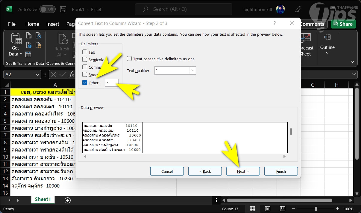 หน้าจอถัดมา เราจะเลือกหลักเกณฑ์ที่ใช้ในการแยกข้อมูล จุดนี้เราต้องพิจารณาว่า "ตัวอักษร" และ "ตัวเลข" มีอะไรที่เป็นตัวคั่นข้อมูลอยู่ อย่างในกรณีของไฟล์ที่เราใช้สาธิตในบทความนี้ จะมีการแยกข้อมูลด้วยเครื่องหมายยัติภังค์ (-) ซึ่งไม่มีในตัวเลือก ดังนั้น ให้เราคลิกเลือกที่ "☑ Other:" แล้วพิมพ์เครื่องหมายยัติภังค์ลงไปในช่องด้านหลัง แล้วคลิก "ปุ่ม Next"
