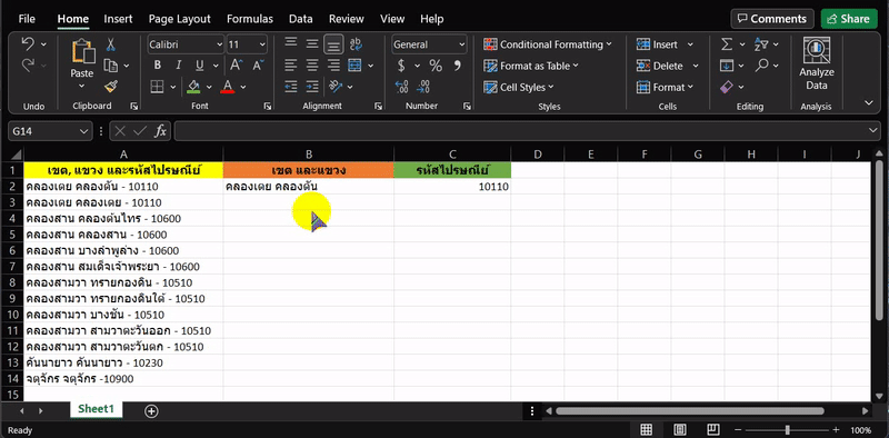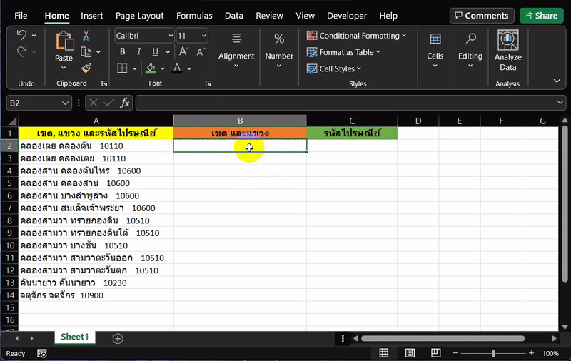 ใส่สูตรลงใน Cell หลังข้อมูลที่ต้องการแยกว่า "=SplitText(A2,FALSE)" เราจะได้ชื่อเขต และแขวงมา ในส่วนของรหัสไปรษณีย์ให้ใช้สูตร "=SplitText(A2,TRUE)" ก็จะได้ผลลัพธ์ดังภาพด้านล่างนี้