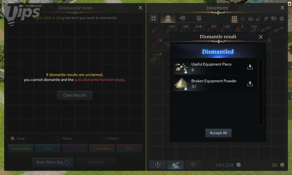 สำหรับผู้เล่นใหม่ในช่วงแรก ๆ อาจจะได้ของสวมใส่มาเป็นจำนวนมาก ทั้งจากเควส และจากการตีมอนทั่วไป เมื่อเราได้ของที่ดีกว่ามาใส่แล้ว ก็ถึงเวลาเคลียร์ของเก่า ๆ ไม่ให้รกช่อง ด้วยการกดที่ "ปุ่มรูปค้อน" หรือ "ปุ่ม Dismantle" เพื่อทำการย่อยของที่ต้องการ จะมีอีกหน้าต่างหนึ่งสำหรับเลือกของเพื่อย่อยทิ้ง ให้จัดการเลือกของที่เราไม่ต้องการใส่เข้าไปเพื่อย่อยออกมา