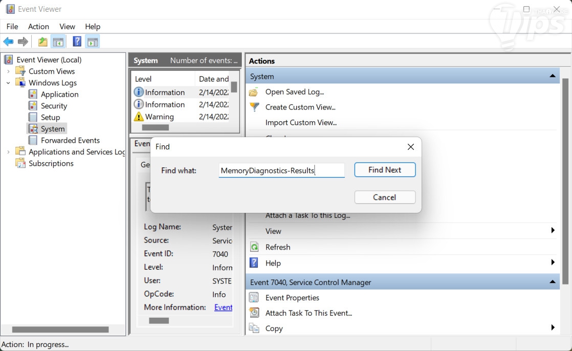 - พิมพ์ลงในช่องค้นหาว่า "MemoryDiagnostics-Results" แล้วคลิก "ปุ่ม Find Next" หากในผลลัพธ์ไม่มีข้อผิดพลาด (Error) เลย ก็ให้ลองทำตามขั้นตอนถัดไป