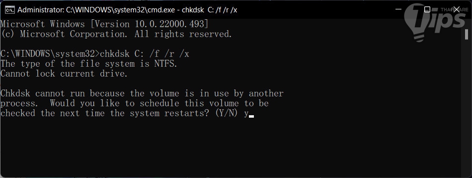 chkdsk C: /f /r /x แล้วกด "ปุ่ม Enter" - มันจะบอกว่าไดร์ฟกำลังใช้งานอยู่ ให้สแกนหลังจากที่คอมพิวเตอร์รีสตาร์ทหรือไม่ ก็ให้พิมพ์ลงไปว่า "y" แล้วกด "ปุ่ม Enter"