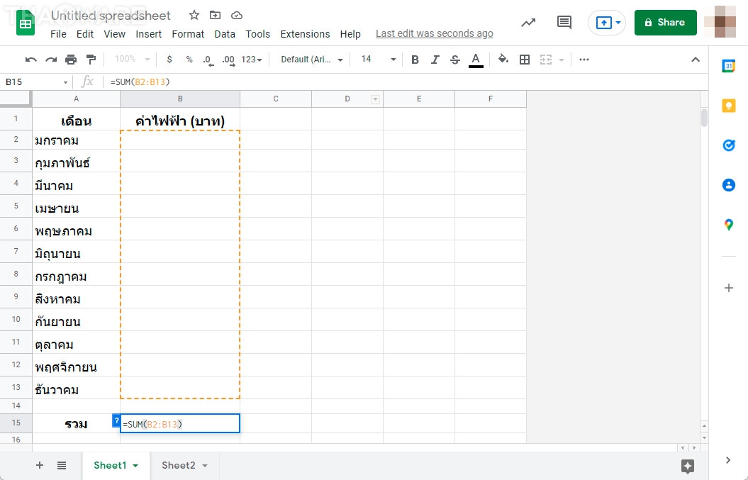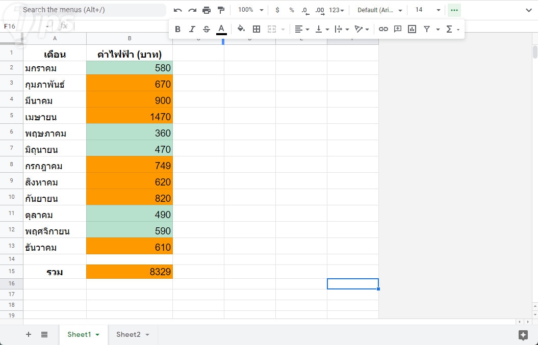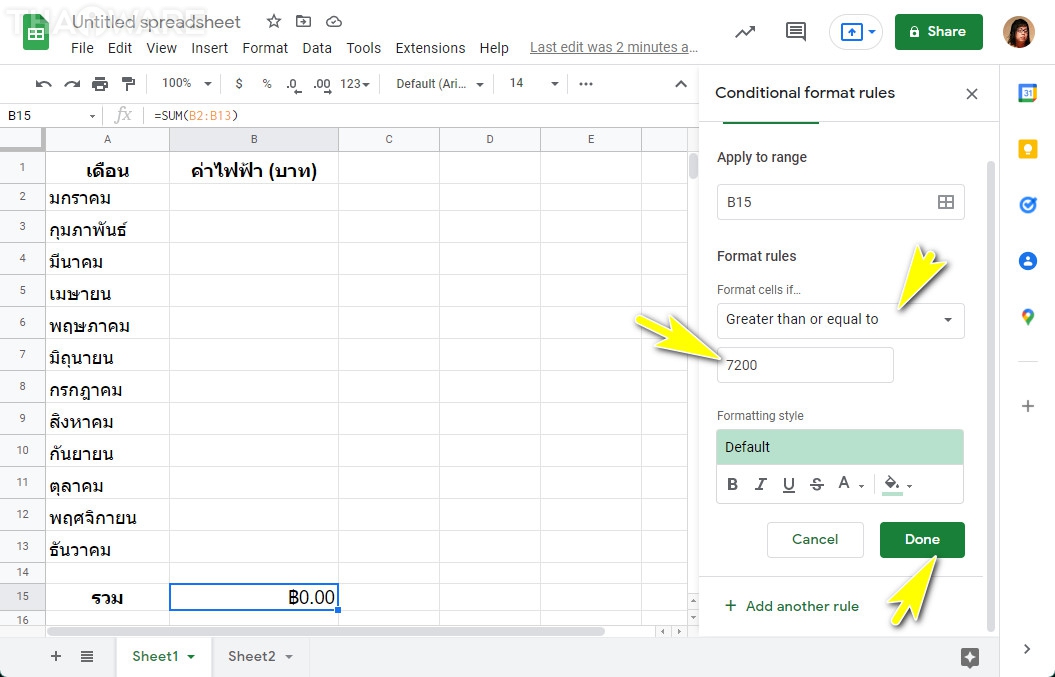 สำหรับช่องด้านบนที่เป็นค่าไฟฟ้ารายเดือน หากต้องการกำหนดค่าให้ตั้งสีอัตโนมัติ ก็สามารถทำได้ด้วยวิธีเดียวกัน แต่ปรับเป็น 600 บาท (มาจาก 7,2000 บาท / 12 เดือน)