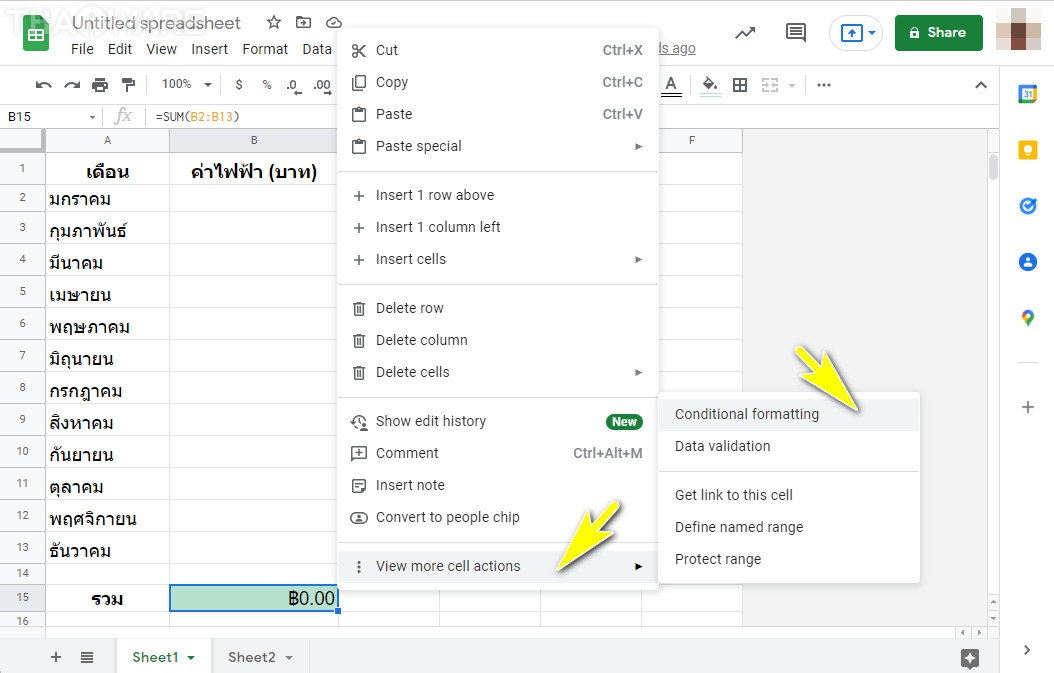 ให้เราคลิกขวาที่ Cell "B15" แล้วเลือก "เมนู View more cells actions" ตามด้วย "เมนู Conditional Formatting"
