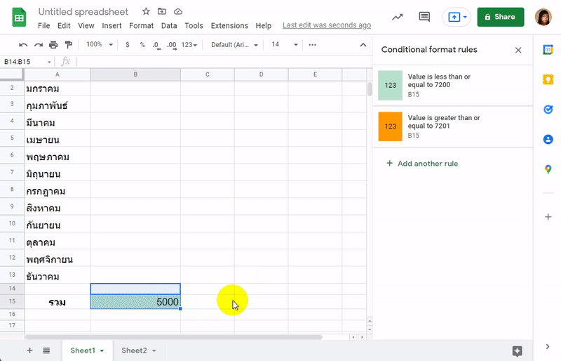 ต่อมาเราต้องการให้ข้อมูลในช่องผลรวมค่าใช้จ่าย "B15" ที่เราใส่สูตร SUM เพื่อรวมยอดเอาไว้ เปลี่ยนสีไปตามที่กำหนด โดยถ้ารวมแล้วยอดเงินต่ำกว่า 7,200 บาท ให้เป็นสีเขียว แต่ถ้ามากกว่าให้เป็นสีแดง