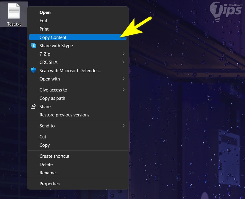 ในการใช้งาน "คำสั่ง Copy Content" ให้เราคลิกขวาที่ "ไฟล์ .TXT" แล้วเลือก "เมนู Copy Content" เท่านี้ ข้อความที่เราพิมพ์ไว้ในไฟล์ .TXT ก็จะถูกคัดลอกไปเก็บไว้ใน Clipboard แล้ว
