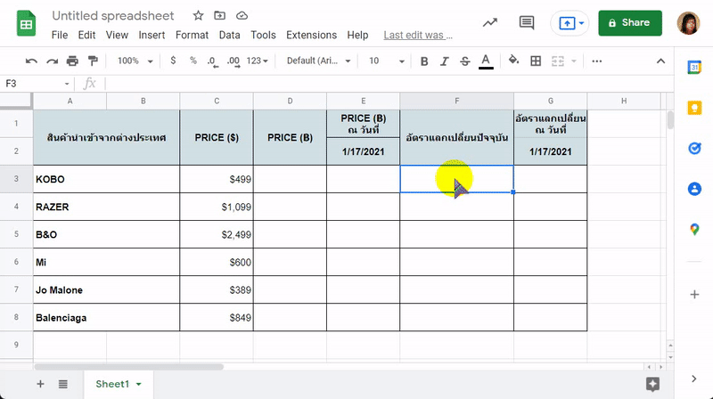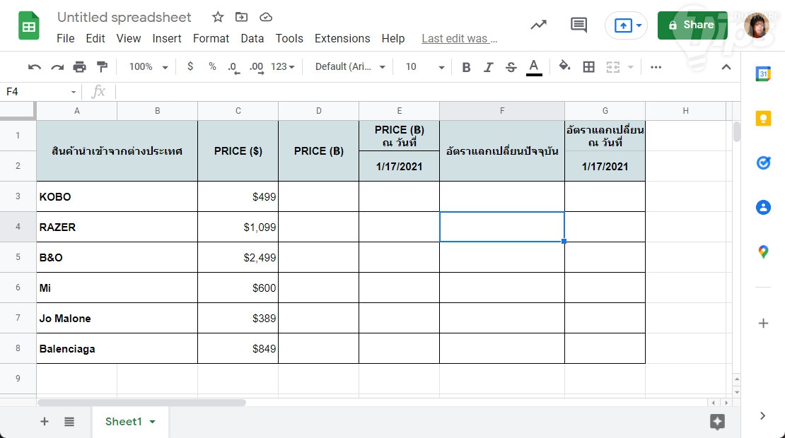 ก่อนอื่นก็ ขอให้เราเปิด Google Sheet ขึ้นมาก่อน เราได้สร้างตารางข้อมูลสินค้าขึ้นมาสำหรับสาธิต ดังภาพด้านล่างนี้ โดยให้เราสร้างคอลัมน์สำหรับแสดงอัตราแลกเปลี่ยนปัจจุบัน ขึ้นมา 1 แถว และคอลัมน์สำหรับแสดงผลลัพธ์ที่ได้จากคำนวณเมื่อนำค่าเงินไปคูณกันแล้วอีก 1 แถว (ประยุกต์ตารางได้ตามใจชอบ)