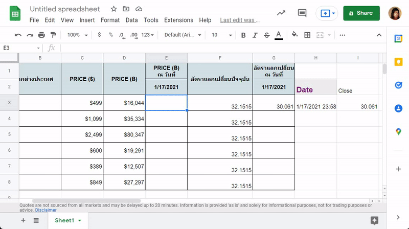 ที่เหลือก็ไม่มีอะไรยากละ ในช่อง "อัตราแลกเปลี่ยน ณ วันที่ 1/17/2021" เราก็ใส่สูตร "= i7" เพื่อ นำข้อมูลค่าเงินของวันที่ 1/17/2021 มาแสดง จากนั้นก็นำข้อมูลราคาดอลลาร์ในช่อง "C3" มาคูณกับช่อง "G3" ด้วยสูตร "=C3*$G3" เท่านั้นเอง