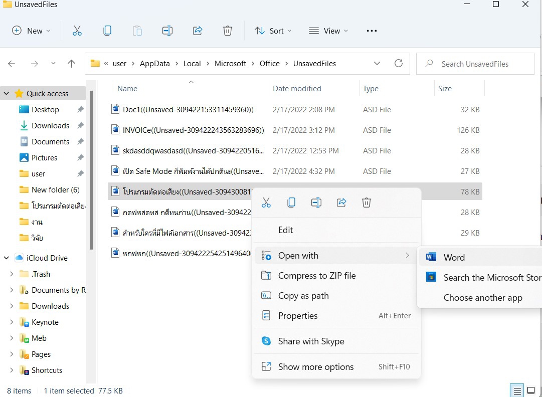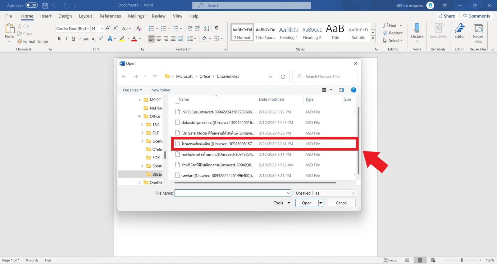 เมื่อนั้น โปรแกรมจะเปิดข้อมูลเอกสารที่ไม่ได้ถูกบันทึกขึ้นมา คุณสามารถไล่ดูไฟล์ โดยสังเกตจากวันที่และเวลา หรือ ชื่อที่บ่งบอกถึงไฟล์ของคุณ