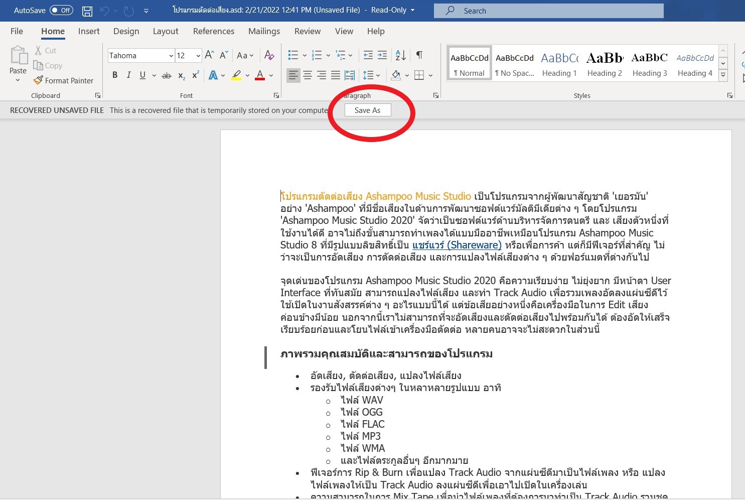 เลือกได้แล้วให้คลิก "ปุ่ม Open" และคุณจะพบว่าข้อมูลทั้งหมดนั้นกลับมาเหมือนเดิมแล้ว ซึ่งขั้นตอนต่อไปก็ให้กดที่ "Save As" เพื่อบันทึกไฟล์ตามปกติ (ไฟล์เอกสารที่ไม่ได้ถูกบันทึกจะถูกเก็บไว้แค่ 4 วันหลังจากนั้นมันจะถูกลบหายไปตลอดกาล)