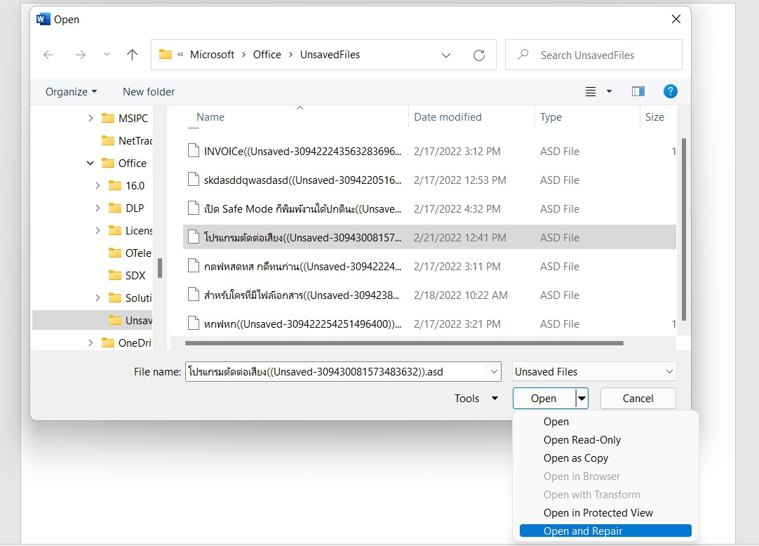 สำหรับกรณีที่เราเปิดข้อมูลขึ้นมาไม่ได้ อาจเป็นไปได้ว่าไฟล์หรือข้อมูลมีการเสียหาย ซึ่งคุณสามารถปรับตัวเลือกตอนกำลังกู้ข้อมูลเอกสารโดยเลือกเป็น "ตัวเลือก Open and Repair" เพื่อซ่อมไฟล์ได้ด้วย