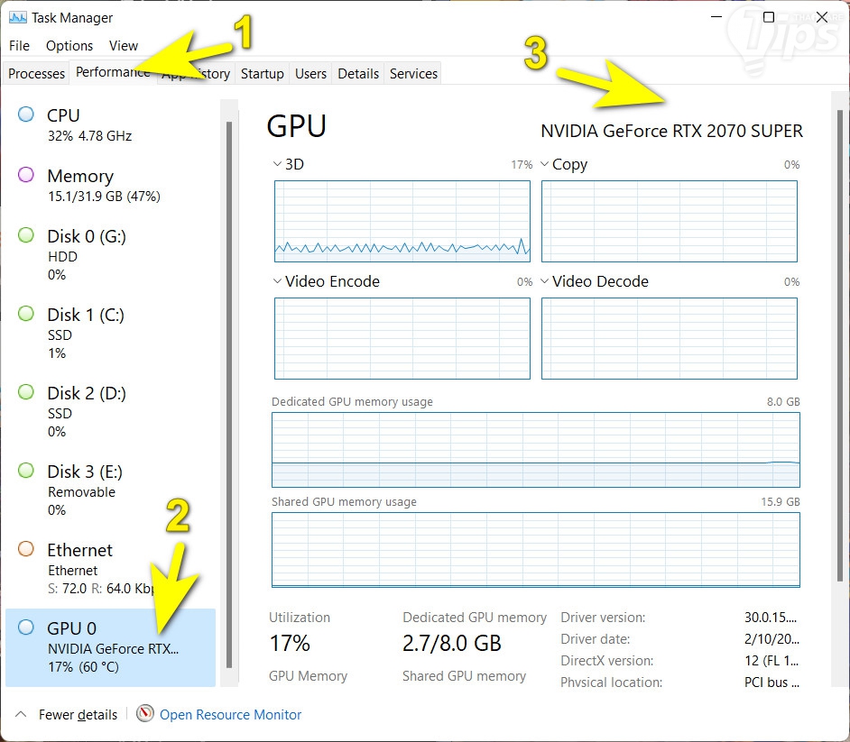 วิธีแรกที่แนะนำ คือการตรวจสอบข้อมูลการ์ดจอผ่านแอป Task Manager ที่มีมาพร้อมกับระบบปฏิบัติการ Windows อยู่แล้ว