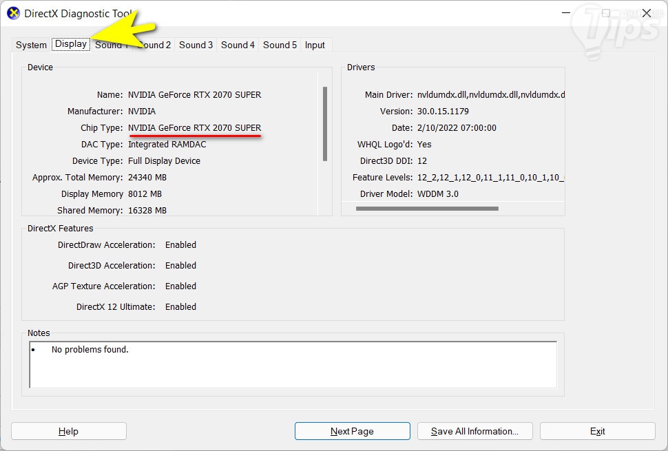 อีกวิธีการหนึ่งที่สามารถใช้ตรวจสอบรุ่นของการ์ดจอได้ คือการใช้เครื่องมือ DirectX Diagnostic Tool ซึ่งเครื่องมือตัวนี้ ยังสามารถใช้ตรวจสอบสเปกของฮาร์ดแวร์ได้อีกหลายส่วน