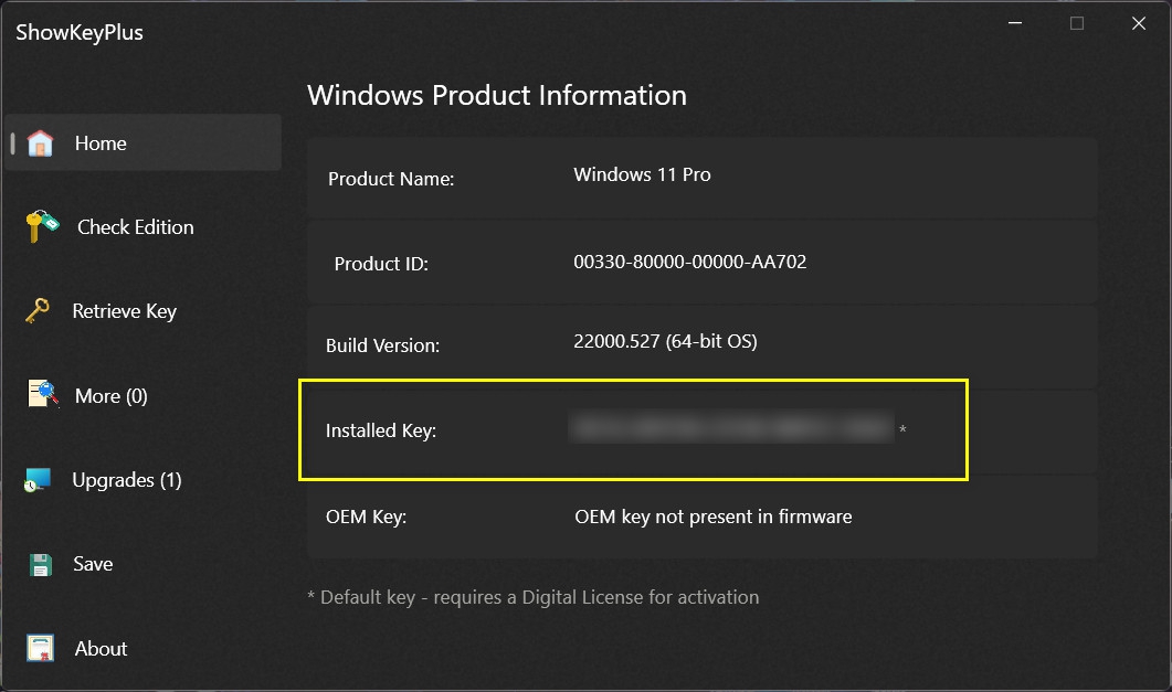 หลังจากติดตั้งแอป ShowKeyPlus เสร็จเรียบร้อยแล้ว ให้เราเปิดมันขึ้นมา ในหน้าจอหลัก (Home) ที่ "เมนู Installed Key" จะบอก Product Key ที่คอมพิวเตอร์ของคุณใช้งานอยู่