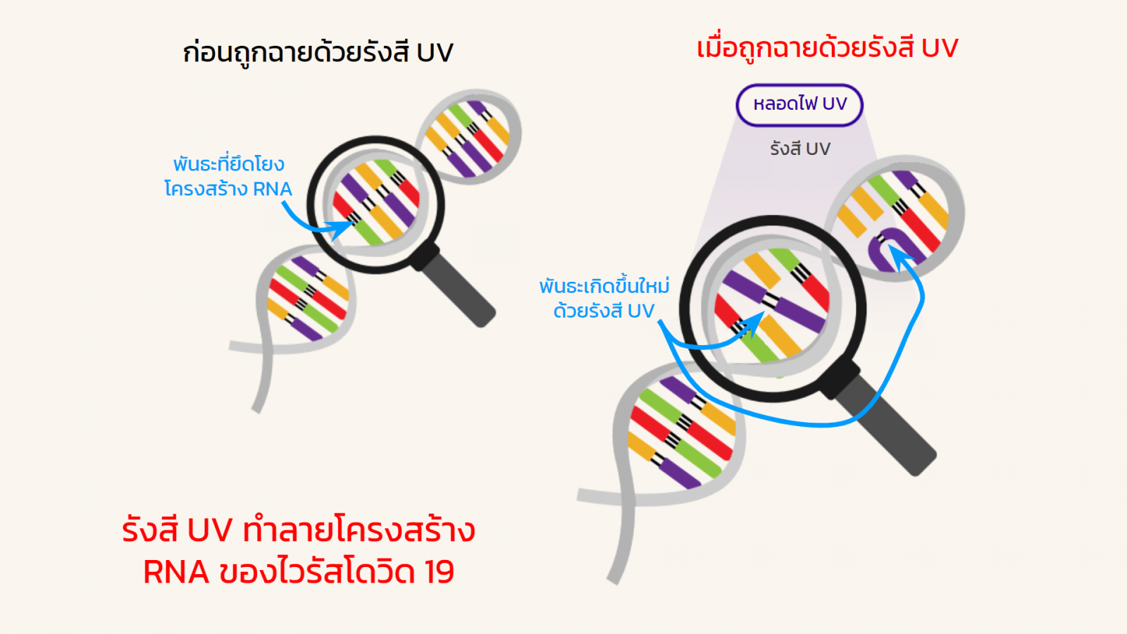 หลักการทำงานของรังสี UV ในการทำลายเชื้อไวรัสโรค (ที่เป็นไวรัสแบบ RNA) รวมถึงเชื้อไวรัสอื่น ๆ ที่เป็นแบบ DNA นั้นมีหลักการคล้าย ๆ กัน ซึ่งเป็นหลักการทางวิทยาศาสตร์ที่ค่อนข้างซับซ้อน แต่ขออธิบายให้เข้าใจแบบง่าย ๆ ตามภาพด้านบนครับ คือ รังสี UV จะทำปฏิกิริยากับสายโซ่ของ RNA ทำให้เกิดการบิดเบี้ยวไปจากเดิม เกิดการจับคู่กันใหม่ของสารเคมีประเภทเดียวกัน และเมื่อโครงสร้างของ RNA เกิดความบิดเบี้ยวขึ้นเป็นจำนวนมาก ทำให้เชื้อโรค ถูกทำลายไปได้