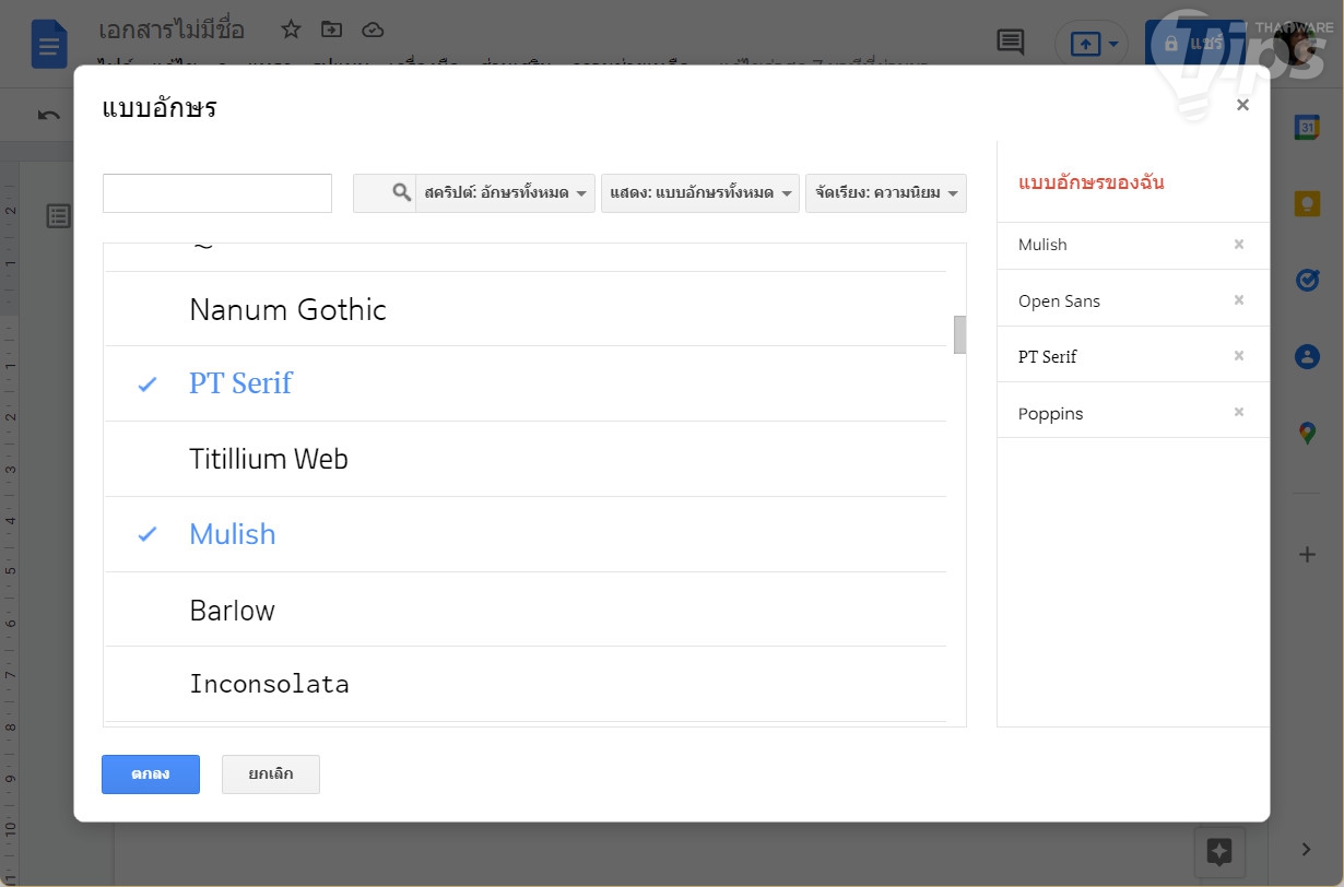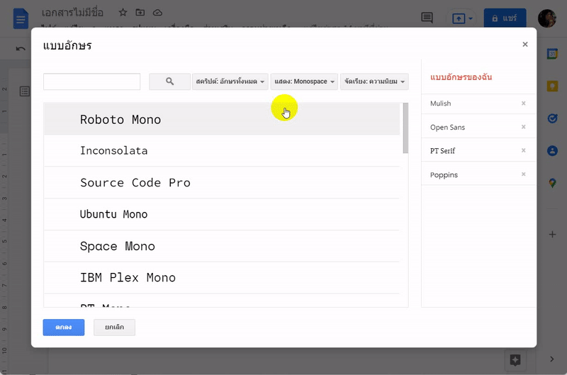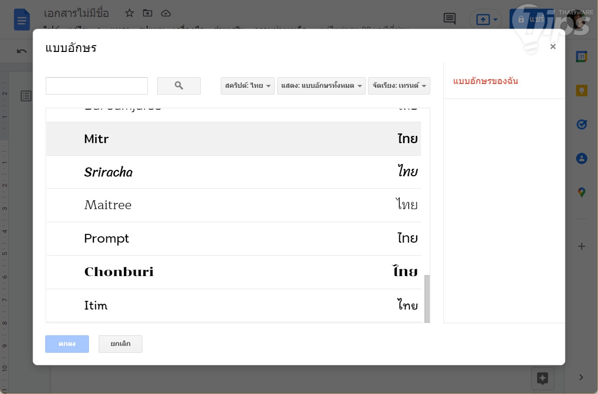 หน้าต่างแอบบอักษรจะแสดงขึ้นมา ให้เราเลือกรายชื่อฟอนต์ที่ต้องการใช้ โดยสังเกตที่พาเนลด้านขวา จะมีหัวข้อ "แบบอักษรของฉัน" ฟอนต์ที่เราเลือก จะไปแสดงผลรวมอยู่ตรงนั้น