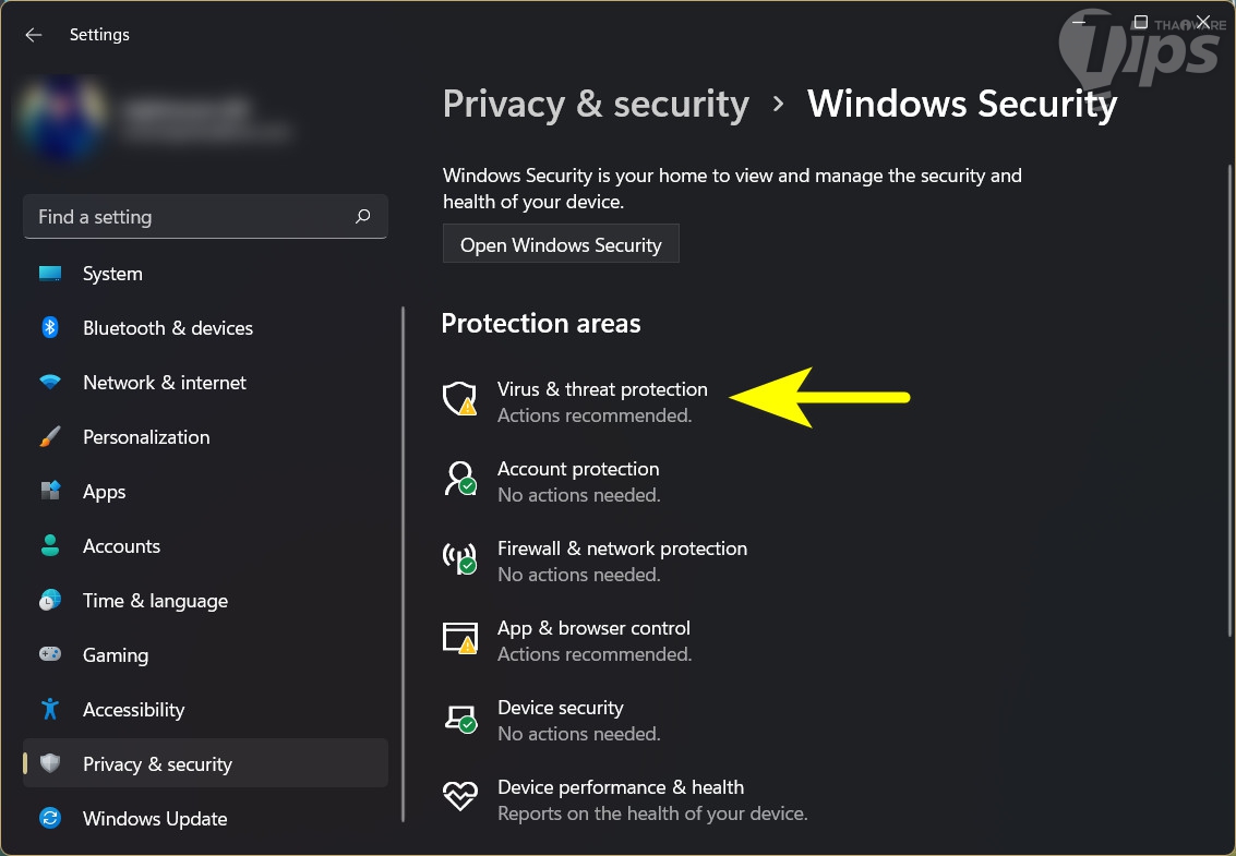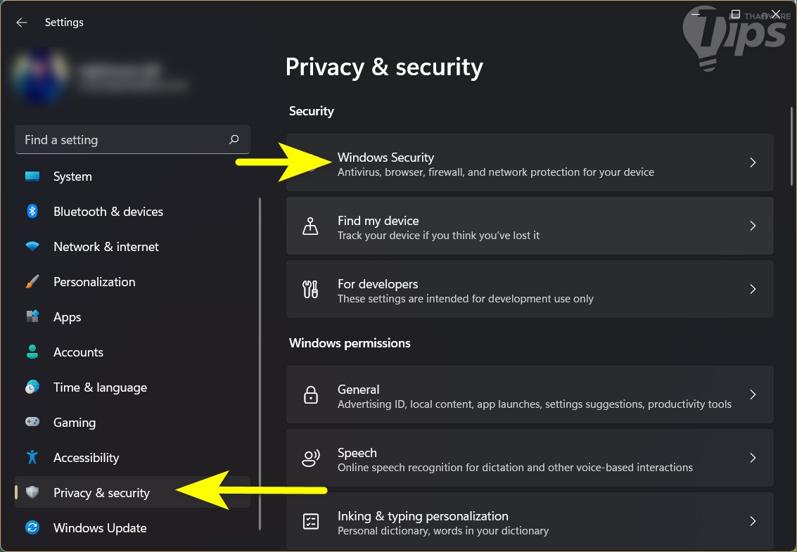 กด "ปุ่ม Windows + i" เพื่อเปิด "แอป Settings" ขึ้นมา ในพาเนลด้านซ้าย คลิกที่ "เมนู Privacy & security" ในพาเนลด้านขวา คลิกที่ "เมนู Windows Security"