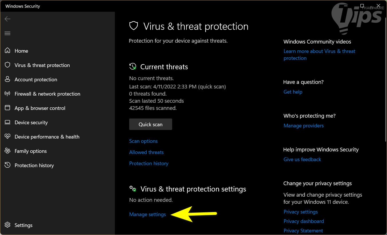 หลังจากนั้น "หน้าต่าง Windows Security" จะถูกเปิดขึ้นมา ใต้ "หัวข้อ Virus & threat protection settings" ให้เราคลิกที่ "เมนู Manage settings"