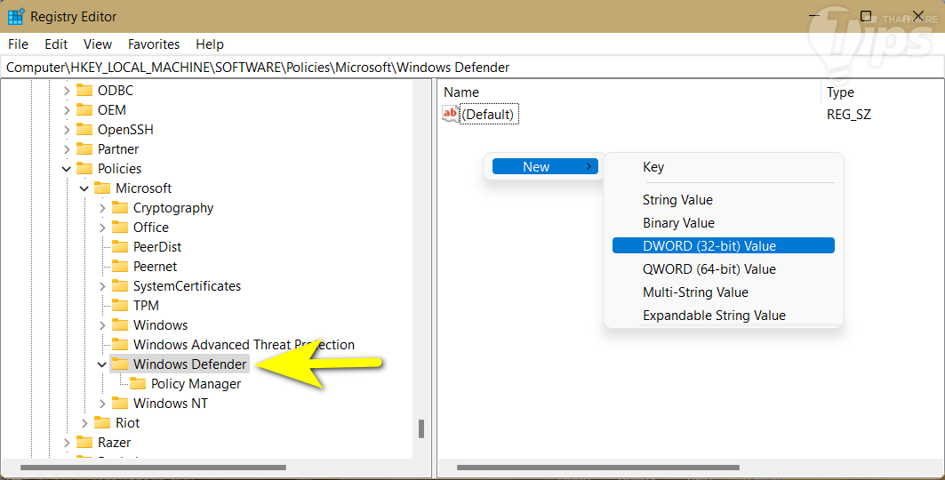 ในพาเนลด้านขวา จะมี "ไฟล์ Turn off Microsoft Defender Antivirus" ให้เราดับเบิลคลิก เพื่อทำการ แก้ไขการตั้งค่า เลือก "เมนู Enable" แล้วคลิก "ปุ่ม OK" (หากต้องการเปิดใช้งาน Windows Defender ในอนาคตให้กลับมาเปลี่ยนเป็น "เมนู Disable" ) วิธีปิด Windows Defender แบบถาวร ด้วย Registry Editor (ทำได้บน Windows ทุกเวอร์ชัน) กด "ปุ่ม Windows + r" เพื่อเปิด "แอป Run" ขึ้นมา พิมพ์ลงไปว่า "regedit" แล้วกด "ปุ่ม Enter" ไปยังตำแหน่ง "Computer\HKEY_LOCAL_MACHINE\SOFTWARE\Policies\Microsoft\Windows Defender" ในพาเนลด้านขวา คลิกขวาบนพื้นที่ว่าง แล้วเลือก "เมนู New" ตามด้วย "เมนู DWORD (32-bit) Value"