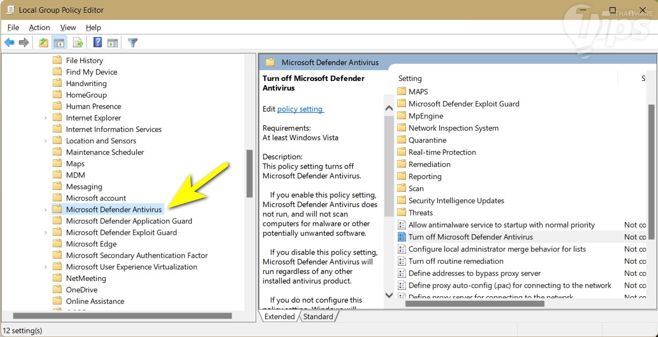 วิธีปิด Windows Defender แบบถาวร ด้วย Local Group Policy (เฉพาะผู้ใช้งาน Windows เวอร์ชัน Pro, Enterprise และ Education) กด "ปุ่ม Windows + r" เพื่อเปิด "แอป Run" ขึ้นมา พิมพ์ลงไปว่า "gpedit.msc" แล้วกด "ปุ่ม Enter" และ "หน้าต่าง Local Group Policy" จะถูกเปิดขึ้นมา ในพาเนลด้านซ้าย ให้คลิกที่ "เมนู Computer Configuration" → "เมนู Administrative Templates" → "เมนู Windows Components" → "เมนู Microsoft Defender Antivirus"
