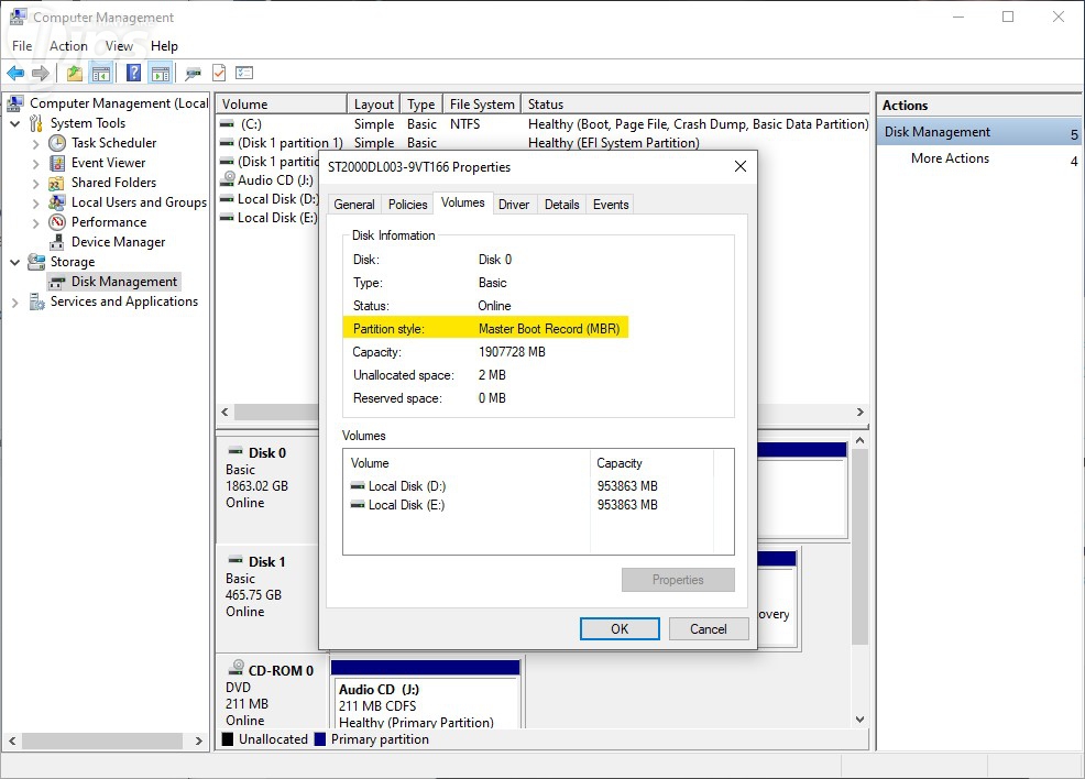 เมื่อหน้าต่างใหม่ปรากฎขึ้น ให้เลือก "เมนู Disk Management" และค้นหาดิสก์ที่เราต้องการแปลงโดยคลิกขวาที่หมายเลขดิสก์ เลือก "เมนู Properties" แล้วคลิกที่ "แท็บ Volume" ตรวจสอบประเภทพาร์ทิชันปัจจุบันว่าเป็น MBR ก่อนทำการแปลง