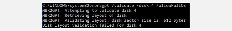 ทีนี้ เราก็มาตรวจสอบดิสก์ที่คุณต้องการแปลงกัน พิมพ์ "คำสั่ง mbr2gpt /validate /disk:[ใส่เลขดิสก์ที่นี่] /allowFullOS" การตรวจสอบจะใช้เวลาสักครู่ ถ้าหากดิสก์ของคุณมีคุณสมบัติไม่ตรงกับความต้องการของระบบ คุณจะได้รับแจ้งข้อความข้อผิดพลาด (Error Message) ดังเช่นตัวอย่างด้านล่าง ที่มาจากการพยายามแปลงแฟลชไดรฟ์ ซึ่งไม่สามารถแปลงได้
