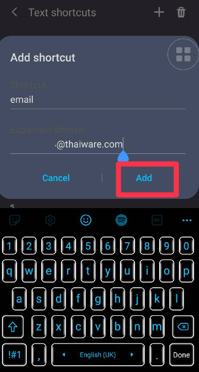 สำหรับการใช้งาน Text Shortcuts บน Android (ทั้งที่ใช้งาน GBoard และ Samsung Keyboard) เองก็คล้ายกับการใช้ Text Replacement ใน iOS เพราะผู้ใช้สามารถแตะใช้งาน Shortcuts ที่สร้างไว้บริเวณแถบด้านบนได้เลย