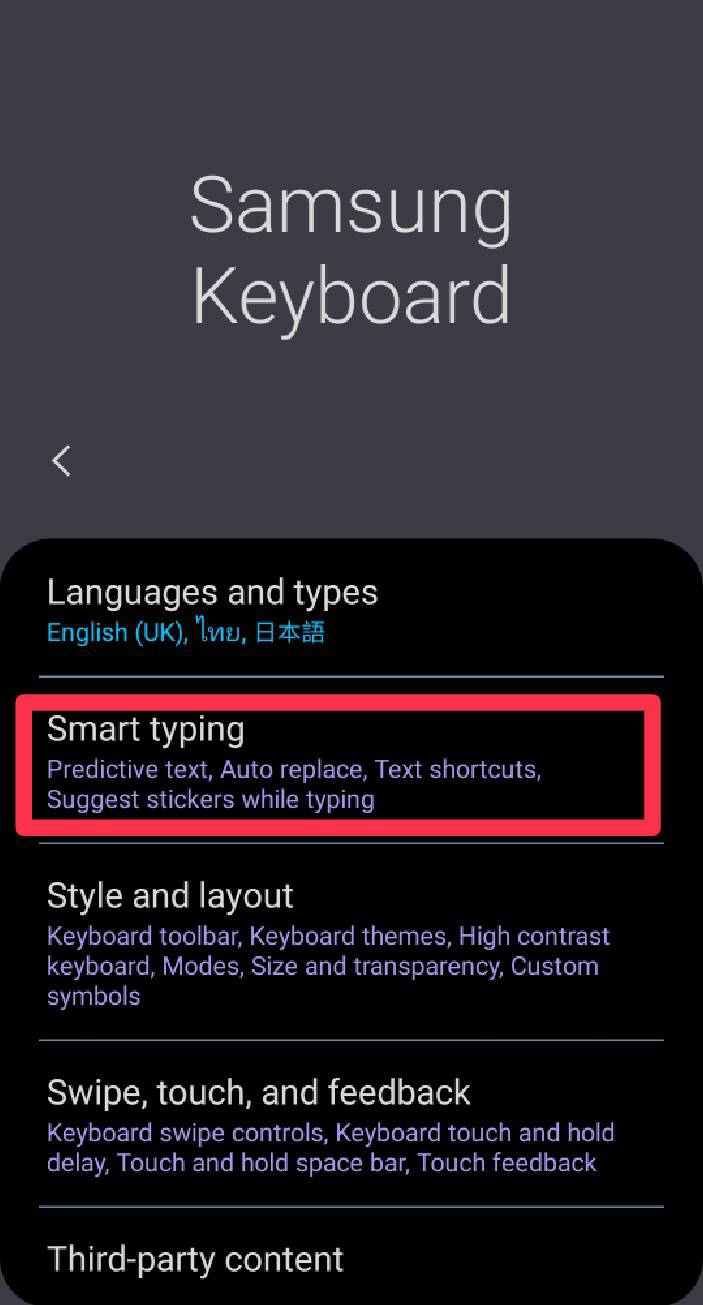 ในส่วนของผู้ใช้ Android ค่าย Samsung อาจจะพิเศษกว่ามือถือ Android รุ่นอื่น ๆ อยู่เล็กน้อย เพราะภายในระบบของ Samsung จะใช้งาน Samsung Keyboard เป็นหลัก แต่ผู้ใช้ก็สามารถตั้งค่า Text Shortcuts ได้เช่นกัน