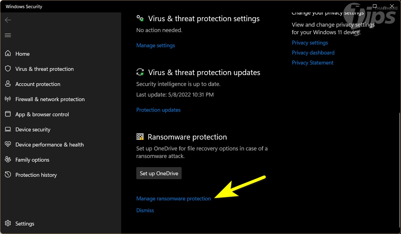 คุณสมบัติป้องกันมัลแวร์เรียกค่าไถ่ใน ระบบปฏิบัติการ Windows เป็นส่วนหนึ่งของ Windows Security ซึ่งเราสามารถเข้าไปตั้งค่าในแอป Settings ได้ด้วยขั้นตอนดังนี้