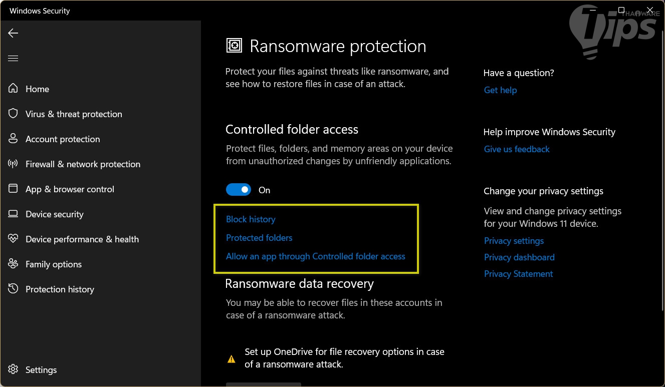 โดยหลังจากที่เราเปิดใช้งานคุณสมบัติ Controlled Folder Access เป็นที่เรียบร้อย สังเกตว่ามันจะมีตัวเลือกเพิ่มขึ้นมาอีก 3 เมนู ดังต่อไปนี้