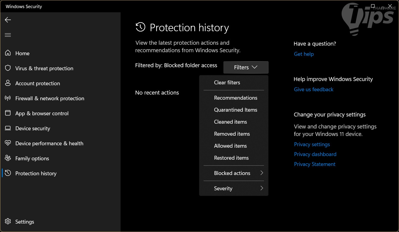 "เมนู Block History" จะแสดงรายการของแอปพลิเคชันที่พยายามจะเข้าถึงโฟลเดอร์ที่คุณตั้งค่าป้องกันเอาไว้ หลังจากที่เปิดใช้งานคุณสมบัติ Controlled Folder Access แล้วพบปัญหาในการใช้งานแอปพลิเคชัน เราก็สามารถเข้ามาในนี้เพื่อตรวจสอบว่า โฟลเดอร์ไหนที่ทางแอปพลิเคชันของเราพยายามจะเข้าถึง หลังจากนั้นจะได้ไปตั้งค่าอนุญาตให้แอปพลิเคชันดังกล่าวสามารถบริหารไฟล์โฟลเดอร์ที่มันจำเป็นต้องใช้ในการทำงานได้