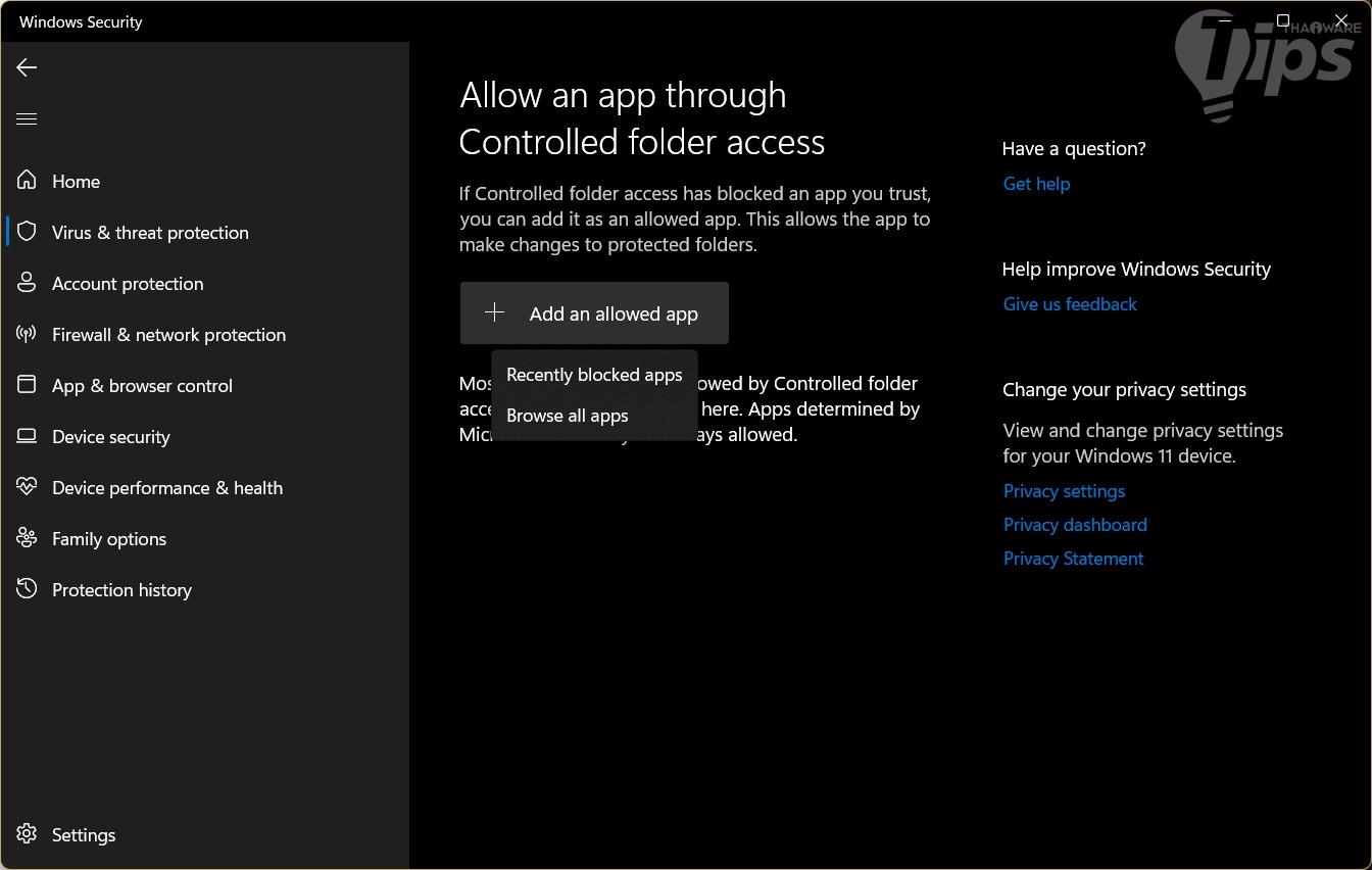 หากคุณมีแอปพลิเคชันที่เชื่อมั่นว่ามันมีความปลอดภัยแน่นอน และไม่ต้องการที่จะปิดกั้นการทำงานของมัน เราสามารถที่จะเพิ่มรายชื่อแอปพลิเคชันดังกล่าวไว้ในรายการแอปพลิเคชันที่ได้รับอนุญาตได้ที่ "เมนู Allow an app through Controlled Folder Access"