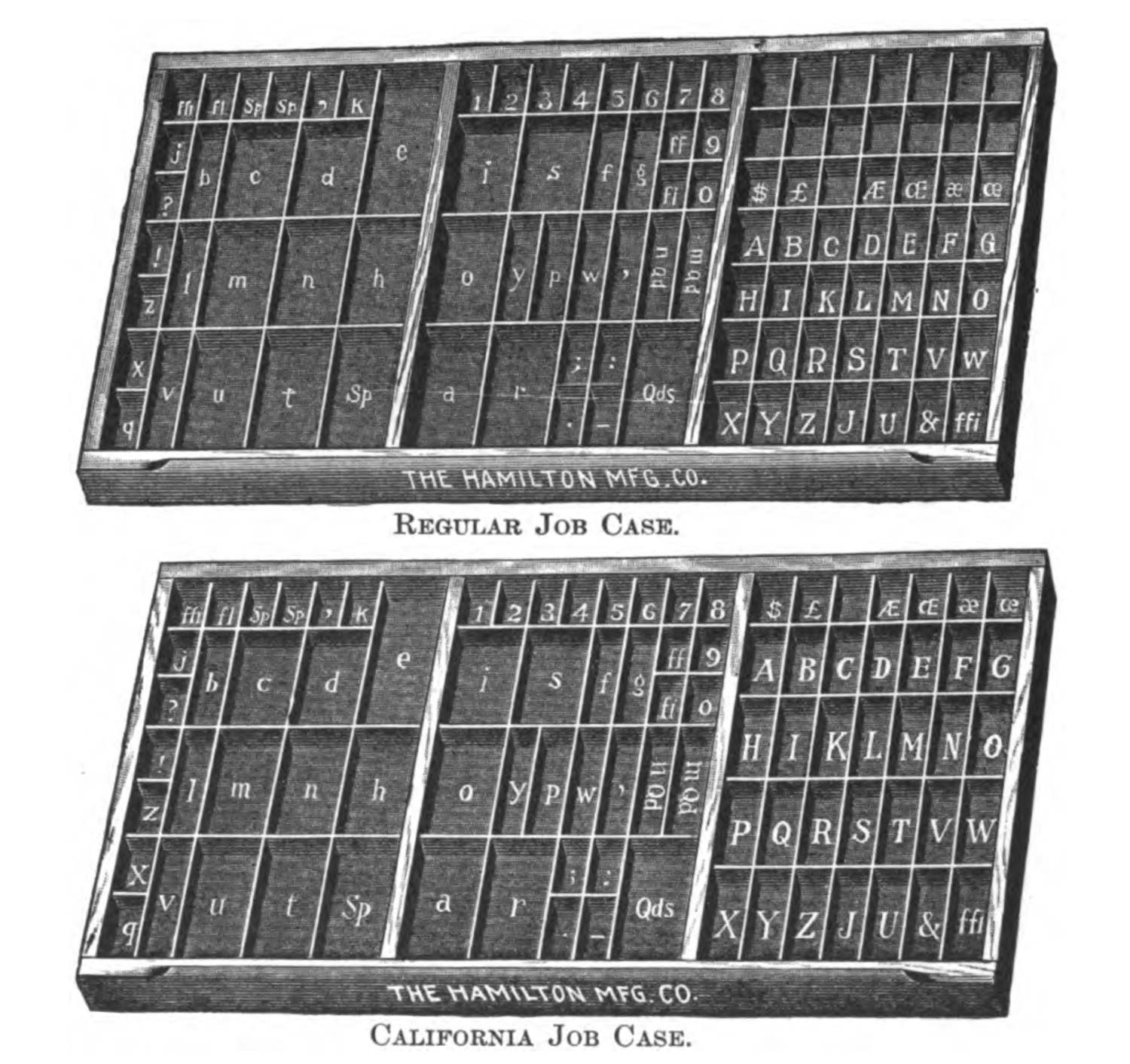 โดยลิ้นชักตัวอักษร (Case) ยอดนิยม (ในประเทศสหรัฐอเมริกา) ก็ได้แก่ "California Job Case" ที่มีการแบ่งช่องตัวอักษรพิมพ์ใหญ่อย่างสมดุลและมีจำนวนช่องพอดีกับตัวอักษร ต่างจากลิ้นชักแบบทั่วไป (Regular Job Cases) ที่แบ่งออกเป็นช่องเล็ก ๆ ทำให้มีช่องว่างสองแถวบนของลิ้นชักฝั่งตัวอักษรพิมพ์ใหญ่