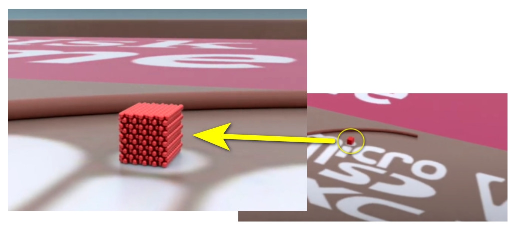 แต่การ์ด MicroSD ที่ว่าเล็กแล้ว ก็ยังเทียบกับ DNA Data Storage ไม่ได้แม้แต่นิดเดียว หากเทียบกันความจุต่อพื้นที่แล้วแล้ว DNA Data Storage จิ๋วเพียงก้อนเดียว (ดูภาพเปรียบเทียบกับการ์ด MicroSD) จะมีความจุถึง 1 TB. หากนำลูกบาศก์ดังกล่าวมาเรียงจนเต็มขนาดเท่ากับพื้นที่ของการ์ด MicroSD ก็จะได้ความจุประมาณ 7,000 TB. เยอะกว่าถึง 7,000 เท่า เลยทีเดียว